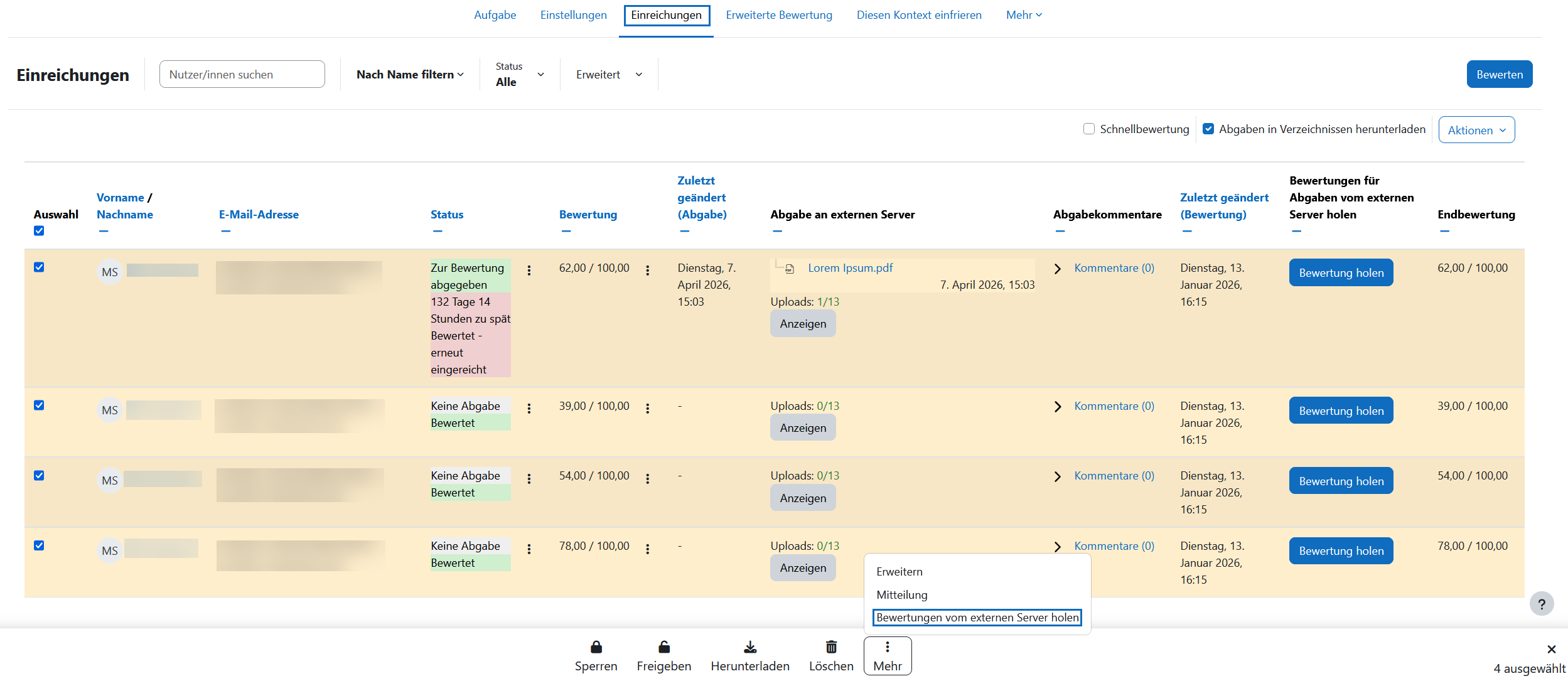 Alternativ können Sie auch mehrere Abgaben markieren, indem Sie die gewünschten Abgaben auswählen oder die oberste Checkbox verwenden, um alle Abgaben auszuwählen. Anschließend klicken Sie in der Taskliste am unteren Bildschirmrand auf Mehr und danach in dem Kontextmenü auf den Button „Bewertung von externen Server holen“.