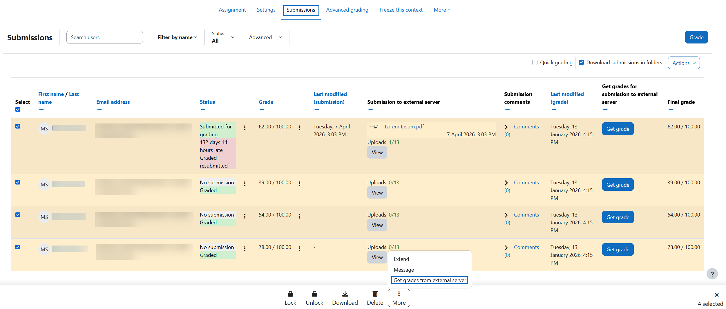 Alternatively, you can select multiple submissions by ticking the box to the left of each one. Selecting the top checkbox will select all submissions. Then click on 'More' in the task list at the bottom of the screen, followed by the 'Get grades from external server' button in the context menu.