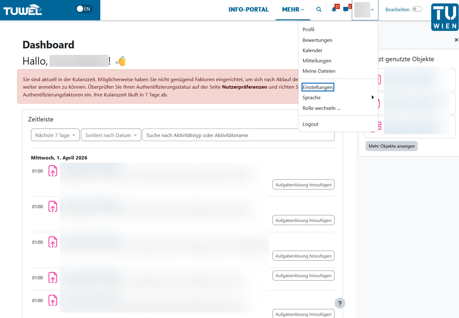Nach Ihrer ersten Anmeldung nach der MFA-Aktivierung durch die Administrator_innen haben Sie eine Kulanzzeit für die Umstellung. Es empfiehlt sich aber die Einstellung sehr zeitnah durchzuführen. Im ersten Schritt öffnen Sie in Ihrem Profil die „Einstellungen“.