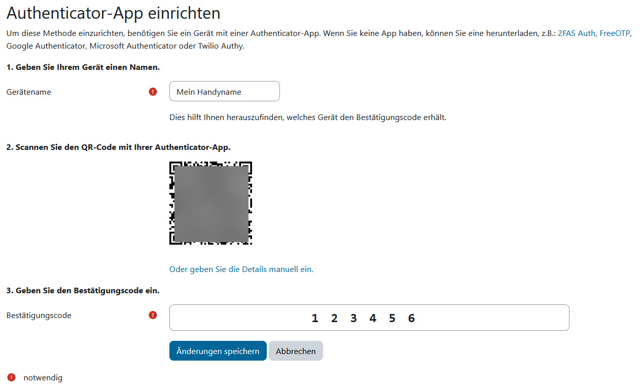 - QR-Code scannen – Öffnen Sie eine Authentifizierungs-App (z. B. Google Authenticator, Stratum, Microsoft Authenticator oder Authy) und scannen Sie den angezeigten QR-Code. Wenn Sie keine Authentifizierungs-App am Gerät installiert haben, ist diese aus den jeweiligen App-Stores zuerst herunterzuladen.