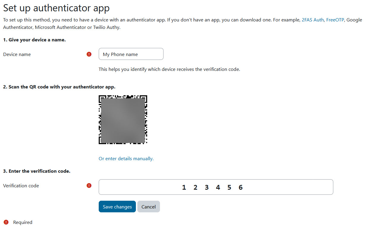 - Scan the QR code – Open an authentication app (e.g. Google Authenticator, Stratum, Microsoft Authenticator or Authy) and scan the QR code displayed. If you do not have an authentication app installed on the device, you must first download it from the relevant app store.