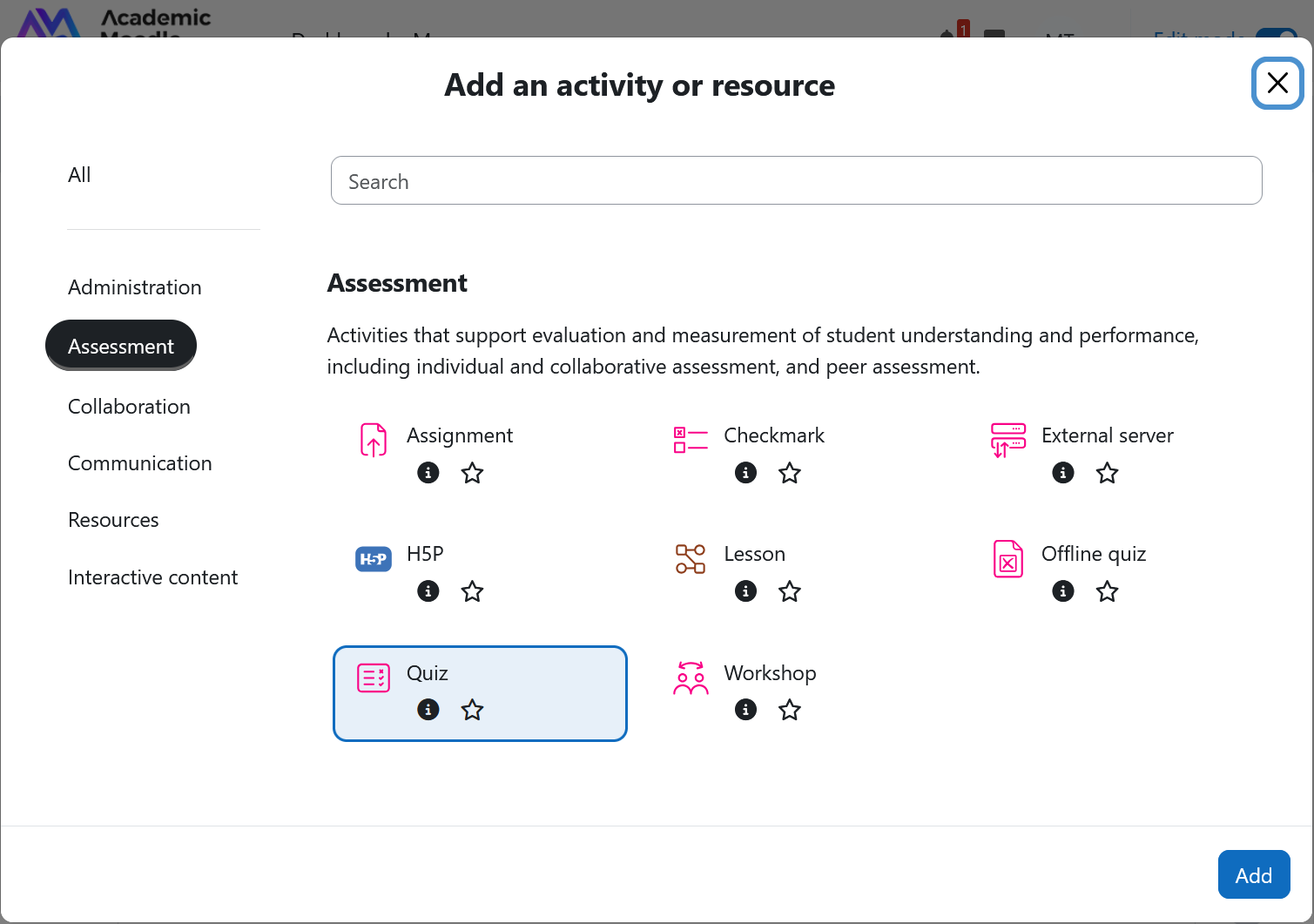 To add a quiz question, click on "Add". There are three different options to add quiz questions.